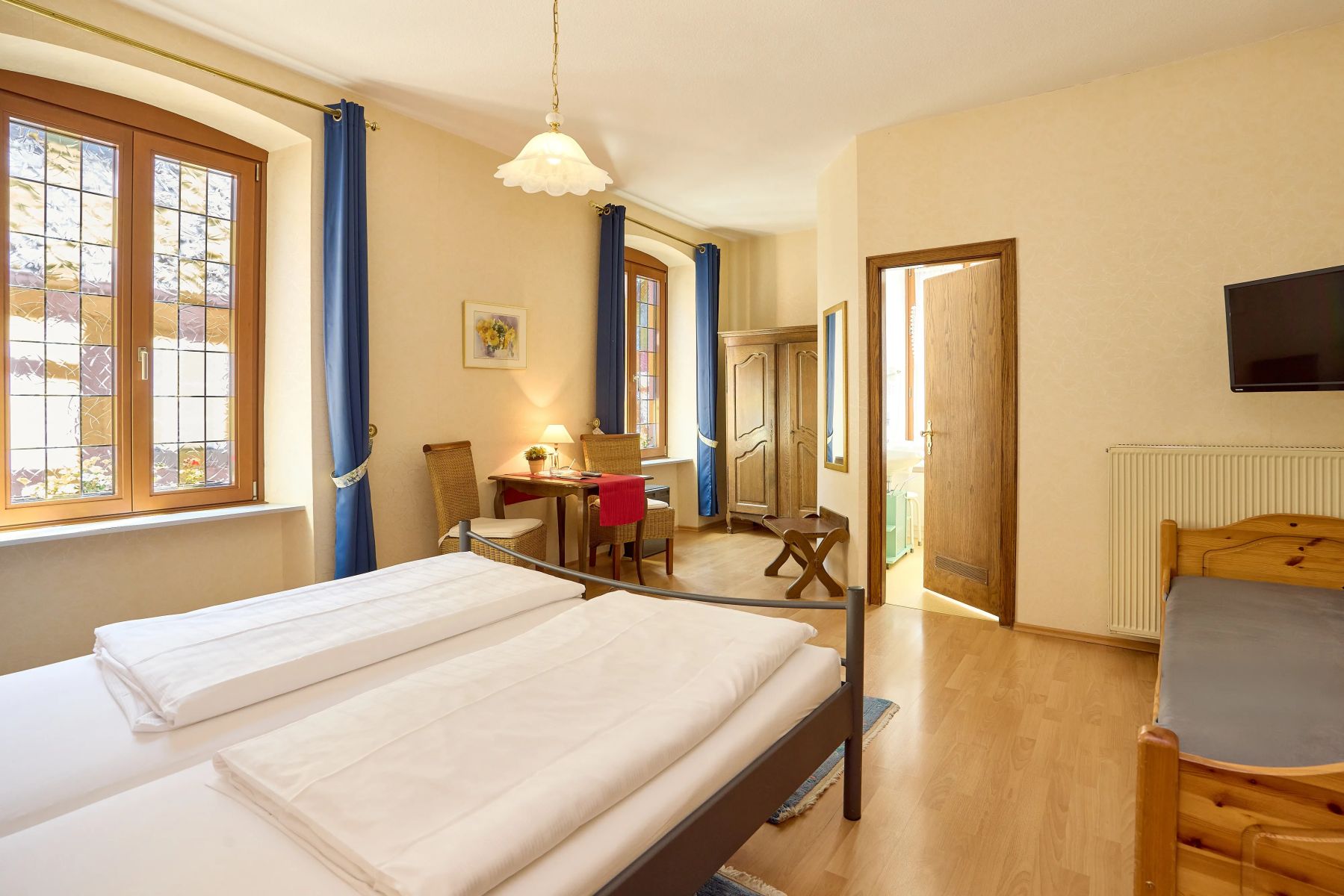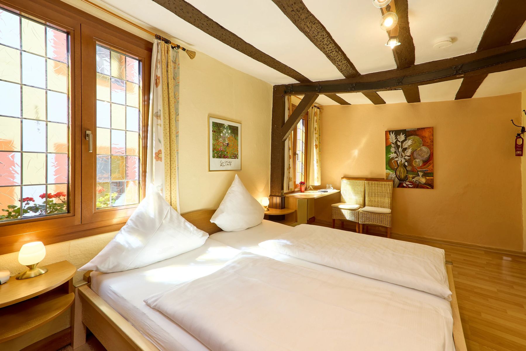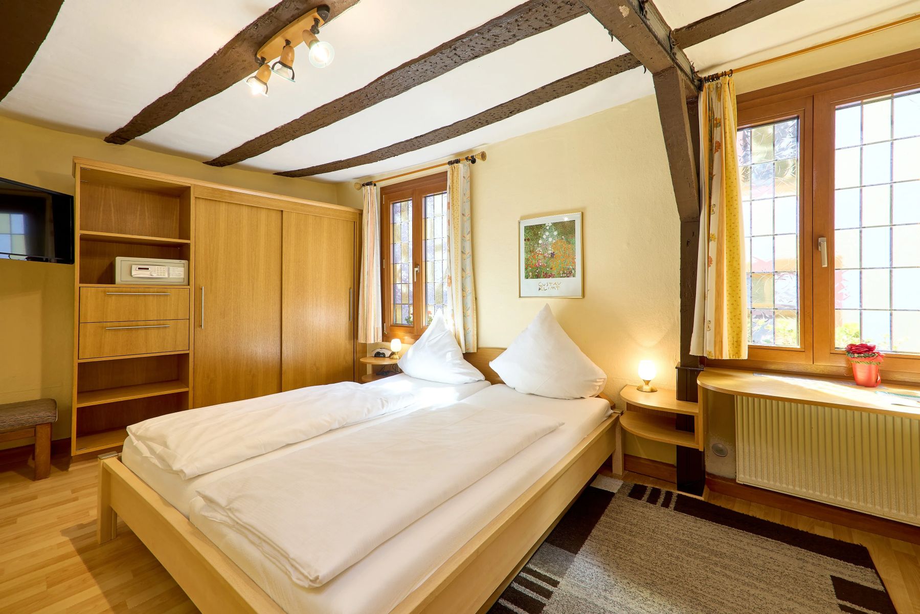 All unsere Hotelzimmer sind Nichtraucherzimmer und mit Dusche/WC, Föhn, Safe, Kabel-TV sowie kostenfreiem WLAN ausgestattet. Vier Zimmer verfügen zusätzlich über eine Klimaanlage. Für die Kleinsten stellen wir auf Wunsch ein Kinderbett bereit (bis ca. 2 Jahre, 11 €). Bitte beachten Sie, dass unser über 700 Jahre altes Haus keinen Aufzug besitzt. Für Fahrräder gibt es abgeschlossene Stellplätze und eine Ladestation. Am Haus stehen insgesamt 4 Parkplätze zur Verfügung. Alternativ können Sie zum Be- und Entladen in der Ladezone am Gestade 6 halten. Anschließend händigen wir Ihnen einen Parkschein aus, mit dem Sie am Moselufer parken können.